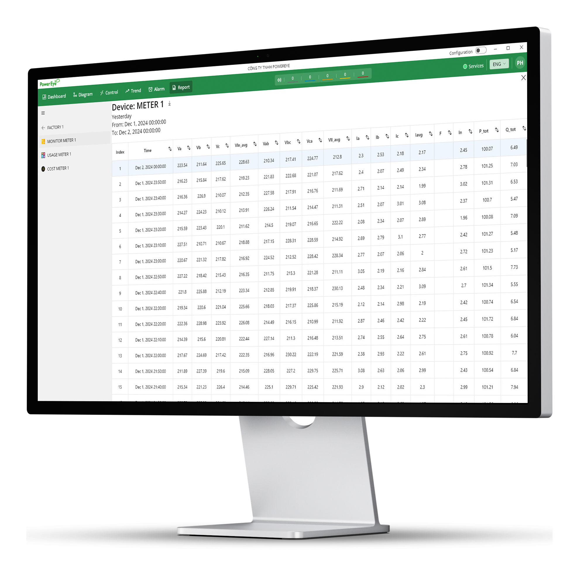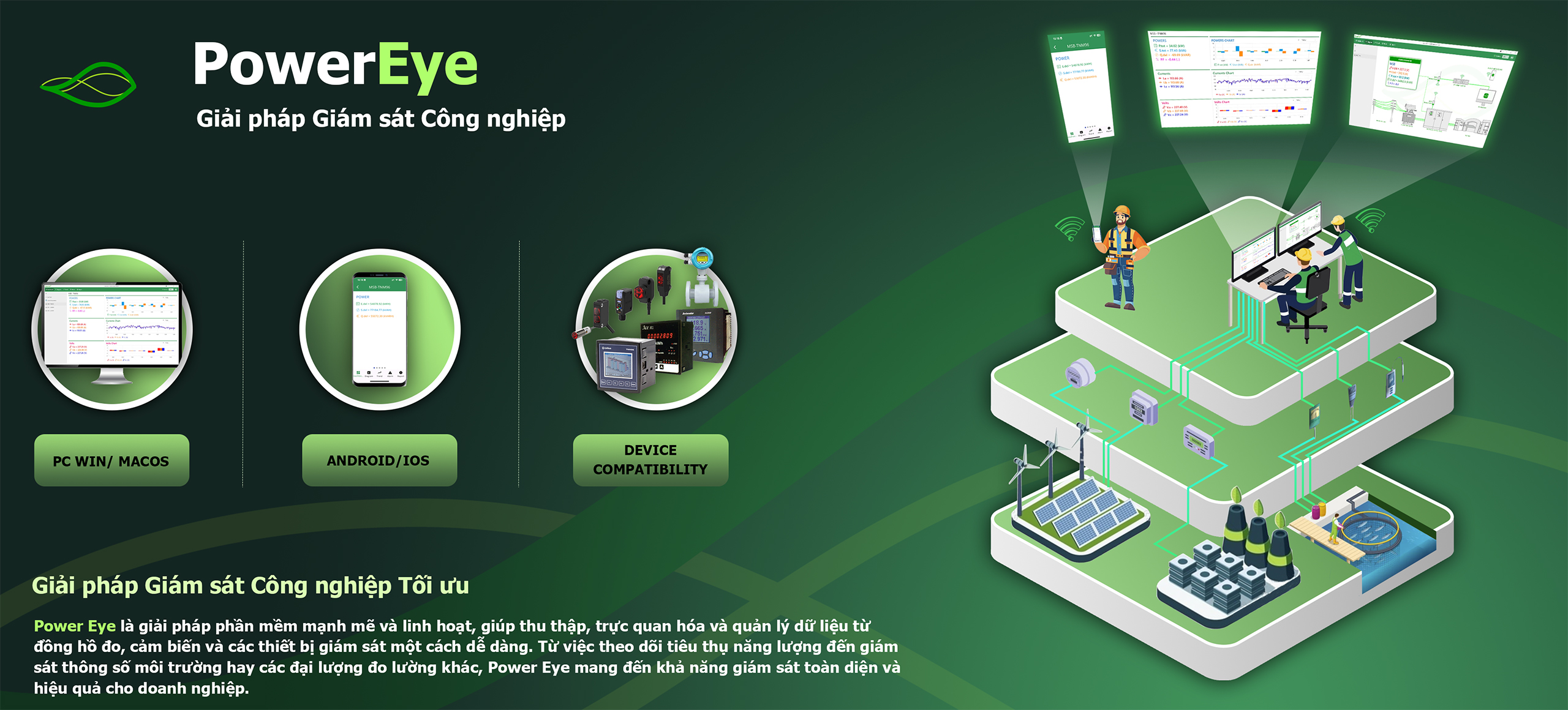 Trong PowerEye, sơ đồ hoạt động như bản thiết kế ảo, cho phép bạn quan sát toàn bộ hệ thống chỉ trong một cái nhìn. Thay vì phải kiểm tra từng thiết bị tại chỗ, bạn có thể nhập bố cục hệ thống và theo dõi các số liệu trực tiếp ngay tại từng vị trí thiết bị trong phần mềm.